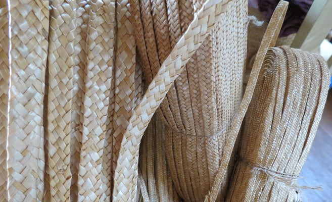 Die Materialien bestehen aus wiederverwendeten Stoffen, Filz und Seidenkrawatten.......Nicht so die Strohhüte, welche meist aus Getreidestroh-Flechtbändern genäht werden.