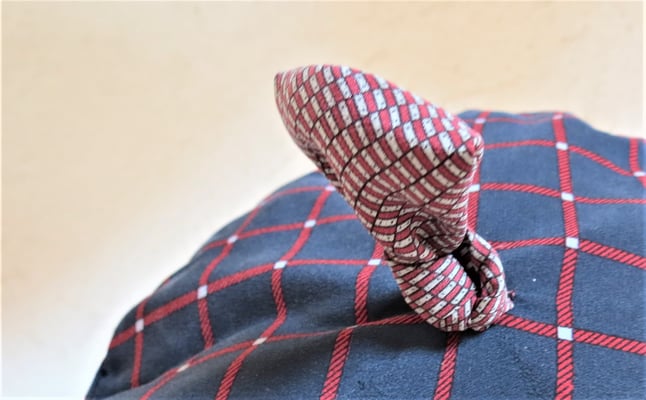 Blaugemusterte Krawattenmütze aus breiten "Retrokrawatten" genäht